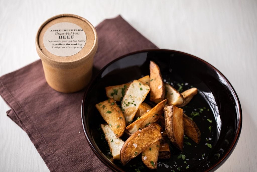 Tallow is fat rendered from cattle and sheep. Anyone who ate at fast food joints before 1990, when chains replaced tallow in their electric friers with vegetable oils, likely knows the taste and texture of really good French fries. A potato cooked in beef tallow gains flavor but absorbs only half as much fat as one cooked in vegetable oil. Tallow fries are crisp, not greasy.